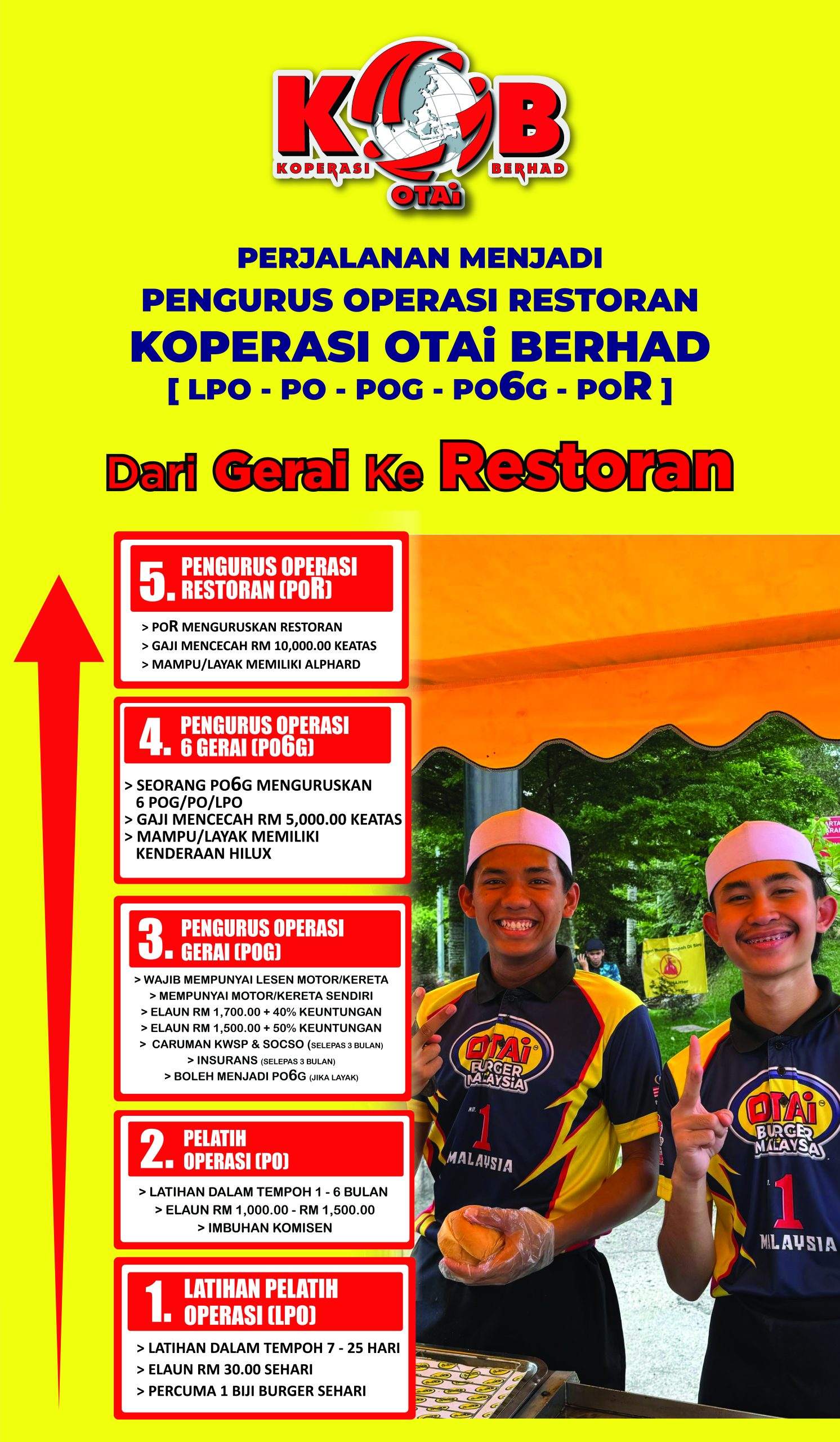 Kami menyediakan peluang pekerjaan kepada golongan belia, selain mempunyai pendapatan daripada gaji dan komisen mereka juga didedahkan dengan ilmu perniagaan serta latihan kerjaya melalui program OTAi Akademi. Sehingga kini, OTAi Burger telah membimbing hampir 400 buah gerai, foodtruck dan kiosk di sekitar Kuala Lumpur, Selangor, Perak, Pahang, Melaka dan Negeri Sembilan.